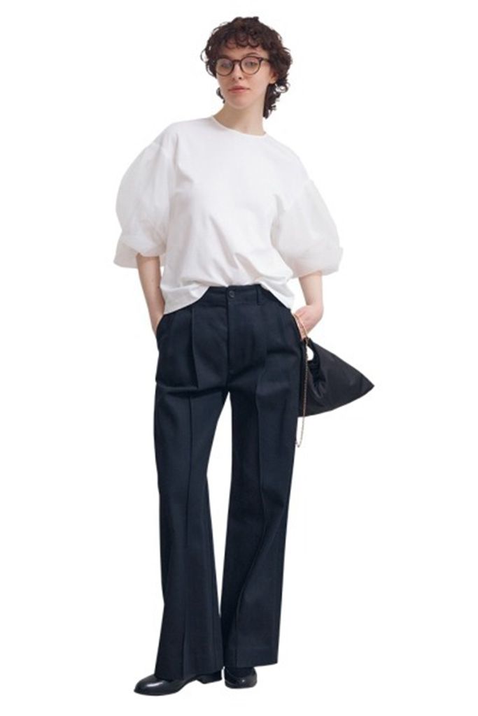 【POINT】1枚で華やぐトップスだから、パンツはミニマルな黒を組み合わせ。スラックスのように穿ける、センタープレス入りの黒デニムでクールに装いながらラフさをひとさじ。