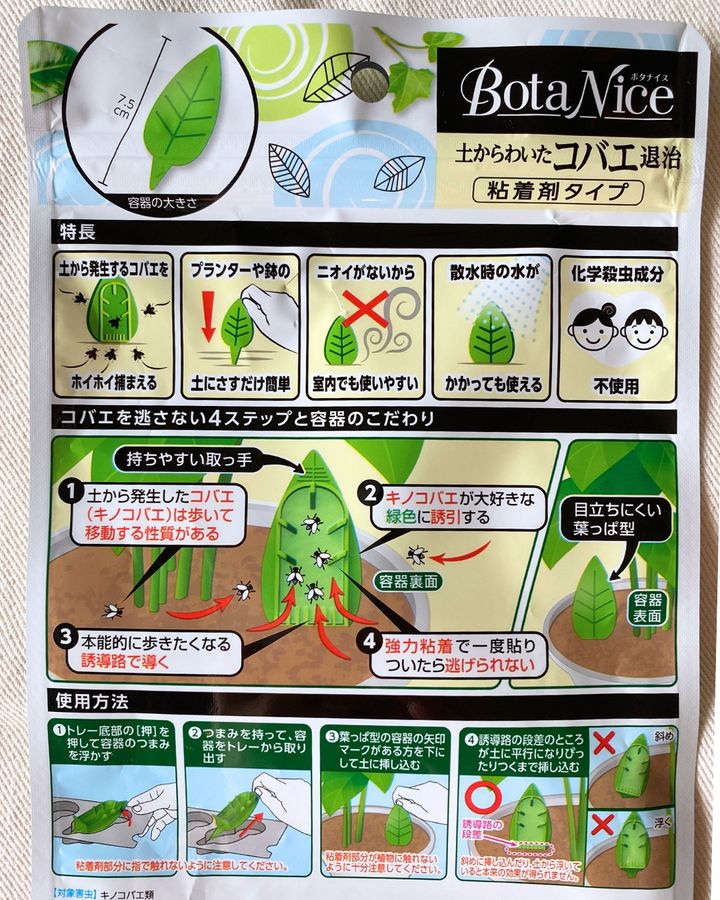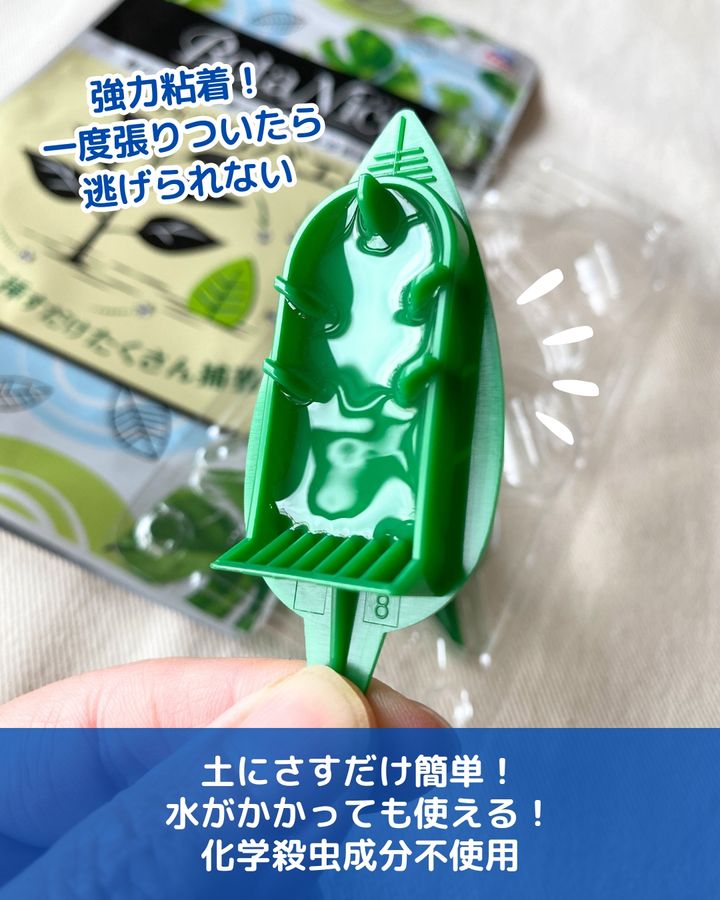 観葉植物の土にわいてしまったコバエを退治する粘着剤で、葉っぱのデザインが可愛くてコンパクト!水がかかっても約1ヵ月使用可能で、薬剤を使用していないので子供やペットがいるご家庭に安心です。