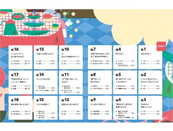 Q1からスタートして、設問に対してaとbからあなたの感覚に近いほうの答えを選び、指示に従って進んでください。最後にたどり着いたA~Fが、あなたのタイプです。