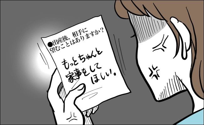 とあるワークショップがあり、そのなかで「出産後、相手に望むことは?」という質問項目がありました。その質問に、なんと夫は「もっとちゃんと家事をしてほしい」と回答したのです! 出産を控えたタイミングでのこの言葉に、思わず私はカチンときてしまいました。