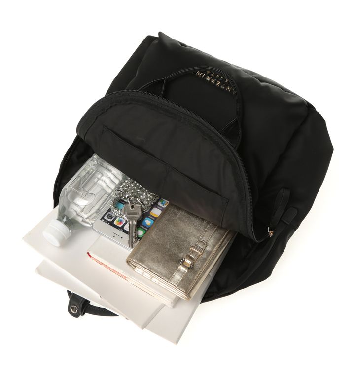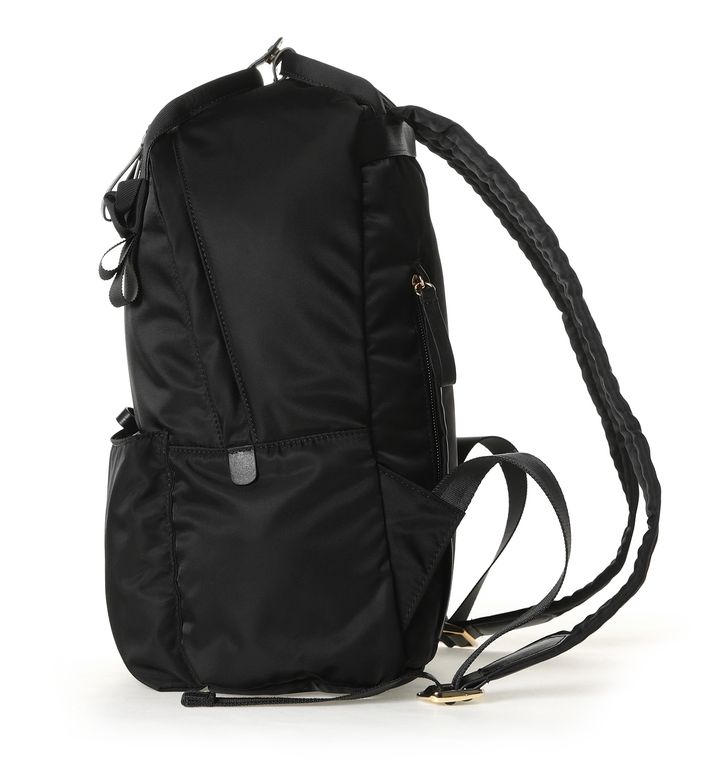 リボンモチーフや光沢のある素材と甘め好きな要素が詰まった黒リュック。きれいめなのに軽量かつ撥水加工で、実用面も優秀。綿入りで厚めに設計されたストラップは、肩への負担も軽減してくれます。背面外側に縦に開閉するファスナーポケットもあり、小物出し入れも片手で楽々!