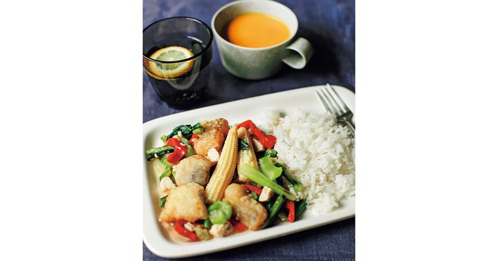 カラッと揚げた鱈のフリットと甘みのある野菜に、ナンプラーの深い旨みが合わさったタイ風香味蒸し。