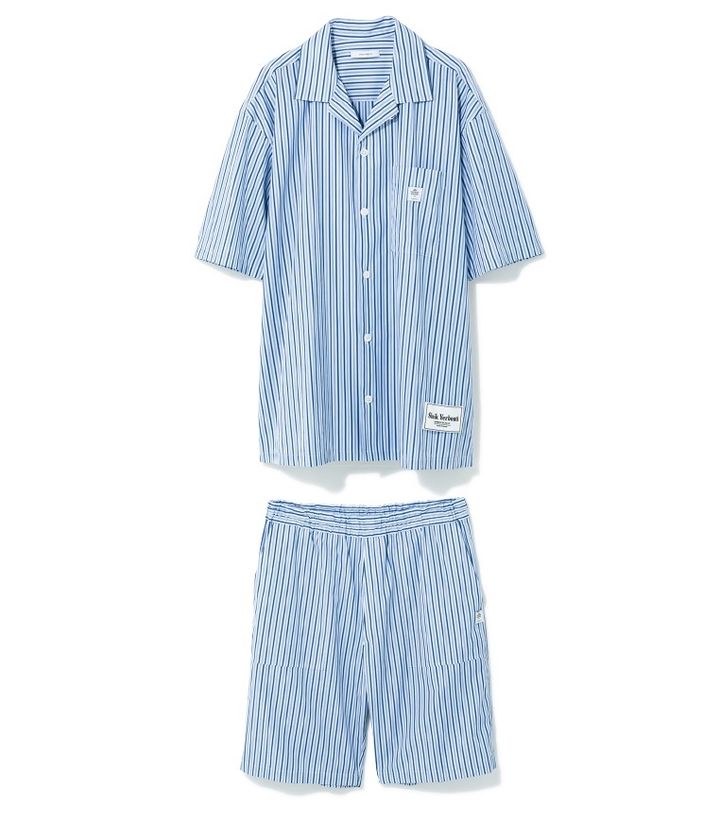 クラシックなストライプ柄が涼しげな印象。オーバーサイズと開襟デザインで、リラックス感あふれる着心地に。シャツ¥35,200 ショーツ¥30,800(シーク ヤブーティ/スタジオ ファブワーク TEL:03・6438・9575)