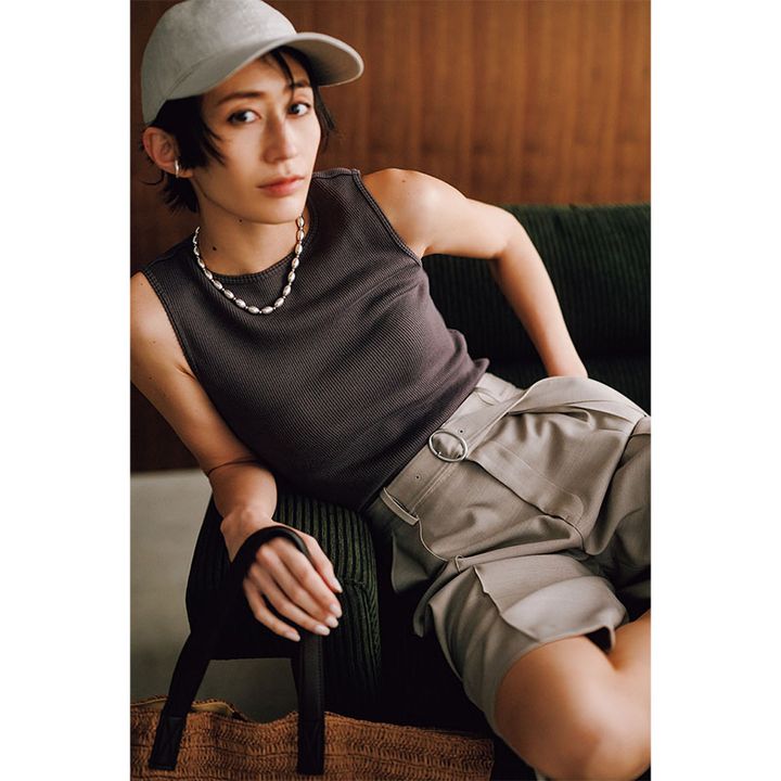 絶妙な色味のブラウンはこの夏の注目カラー。スポーティな時こそ肌見せ部分を多くして大人なカジュアルを演出したい。「こういうのが結局一番着るよね」が撮影時のスタッフからの声。シンプルだけど持っておくべきアイテム。写真のブラウンのほかにホワイト、ブラック、ライトグレーの4色を販売します。ワンサイズ展開。タンクトップ¥10,780(タイムレスウーマン)パンツ¥20,900(ミースロエ)キャップ¥6,490(ミラオーウェン/ミラオーウェンルミネ新宿2店)イヤーカフ¥18,480(ノムグ)ネックレス¥15,750(アビステ)バッグ¥37,730(ニナバックズ/ピーチ)