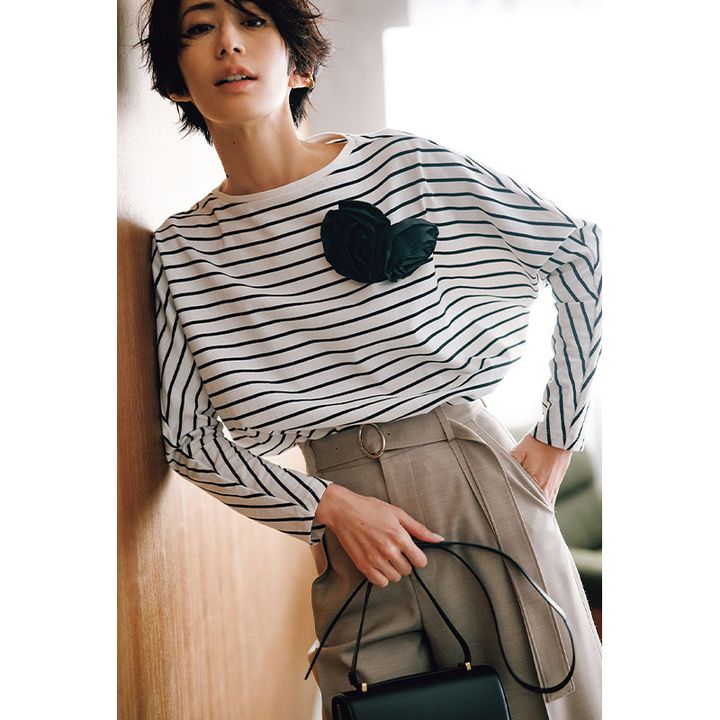 シンプルな長袖のボーダーでも袖がドルマンになっているだけでオシャレ見え。コサージュをデイリーカジュアルに投入した新鮮コーデは今年取り入れたいトレンドのひとつ。写真のボーダーとホワイト、ブラックの 3色を販売します。ワンサイズ展開。コサージュ付きカットソー¥12,980(ミラオーウェン/ミラオーウェンルミネ新宿2店)パンツ¥20,900(ミースロエ)イヤーカフ¥10,000(ヨア)バッグ¥112,200(フランツロアー/シップスインフォメーションセンター)