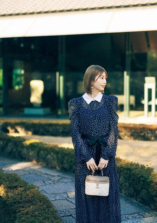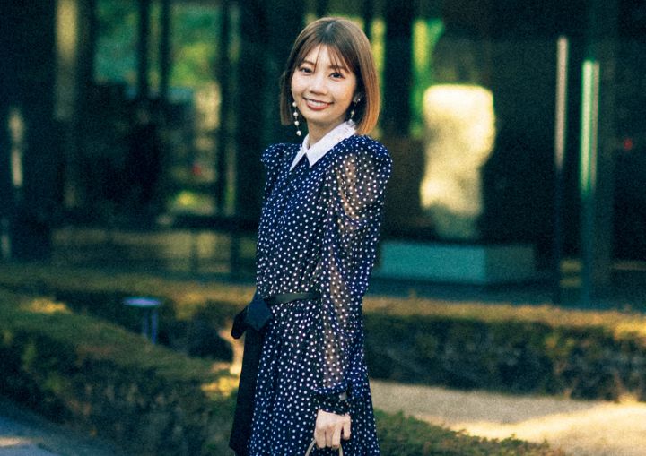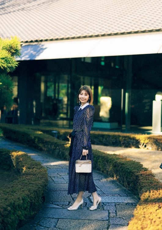 ドット柄ワンピース¥83,600/コルコバード(フィルム) イヤリング¥4,950/MEX(ロードス) リング(右手中指)¥64,900、リング(右手人さし指)¥90,200/ともにアナプノエ(フォーティーン ショールーム) バッグ¥17,050、パンプス¥17,600/ともにダイアナ(ダイアナ 銀座本店)