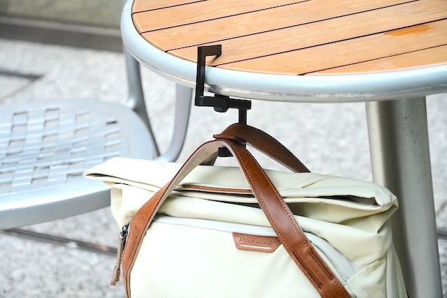 お天気のいい日は公園やカフェのテラス席でのランチも素敵。とはいえやっぱりバッグを地面には置くのはためらってしまいます。そんなときもコンパクトフックがあればバッグを汚すことなく収納が可能。外でも思い切りランチを楽しめそうです。