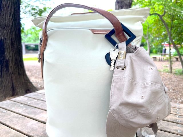 バッグにつけたコンパクトフックに鍵や帽子など、ちょっとした荷物をかけておくのも便利です。