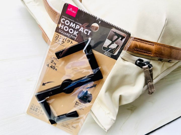 外出時の荷物の収納に一役買ってくれるコンパクトフック。プチストレスを100円で解決しちゃいましょう!