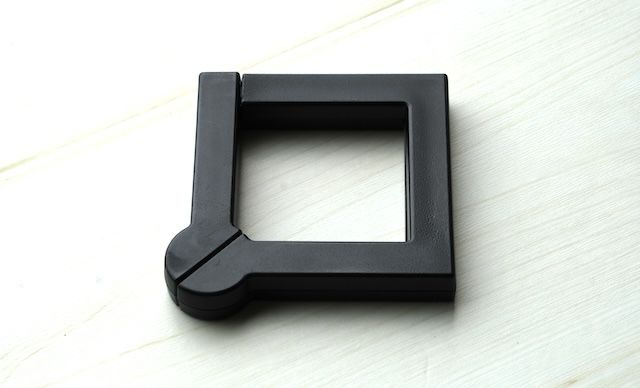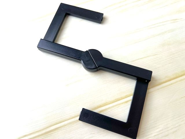 パッケージから出したフックは黒くてフラット。全体的にカクカクとしたS字フックのような形をしています。ポリアセタールというプラスチックのような材質でできていてとても軽量! 量ってみたところ重さは約26gでした。
