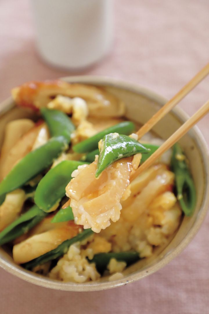 3. スナップエンドウとちくわでお手軽!早うま『卵とじ丼』のレシピ【節約にも】