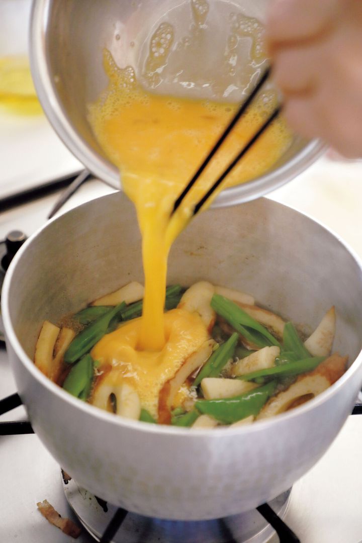 (2)小鍋に〈煮汁〉 の材料を中火で煮立て、スナップエンドウとちくわを加え、2分ほど煮る。溶き卵を回し入れ、ふんわりとしたら火を止める。器にご飯を盛り、卵とじを汁ごとのせる。