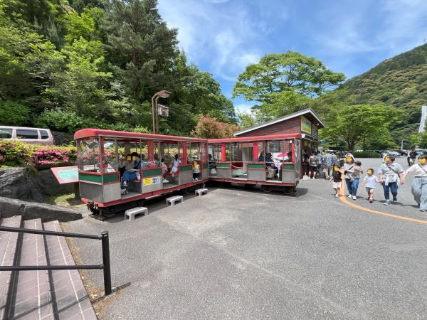 広い駐車場から入口に向かうと見えてくるトロッコ列車は、休憩したり飲食できる場所になっています!列車の中でというだけでなんだかわくわくしてきます。