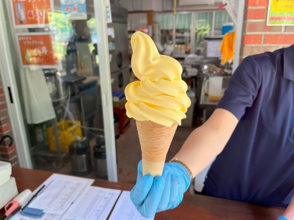 バーベキューコーナーで名物の八寿みかんソフトを購入できました。甘さと酸味が絶妙のおいしいソフトクリームでした!