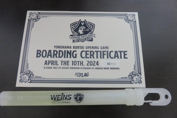 入場すると、沢山のプレゼントが頂けました。 4月10日(水)限定「横浜BUNTAI開幕戦乗船証明書」ポストカード(乗船ナンバー入り) WEINS×BCORサイリウム