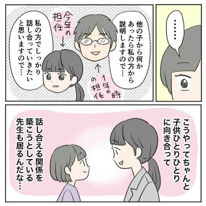子どもひとりひとりとしっかり向き合おうとする先生に、みんなが安心して過ごせるクラスになっているのかもと感じ、前向きに話し合えたことほっとするまりまりさん。