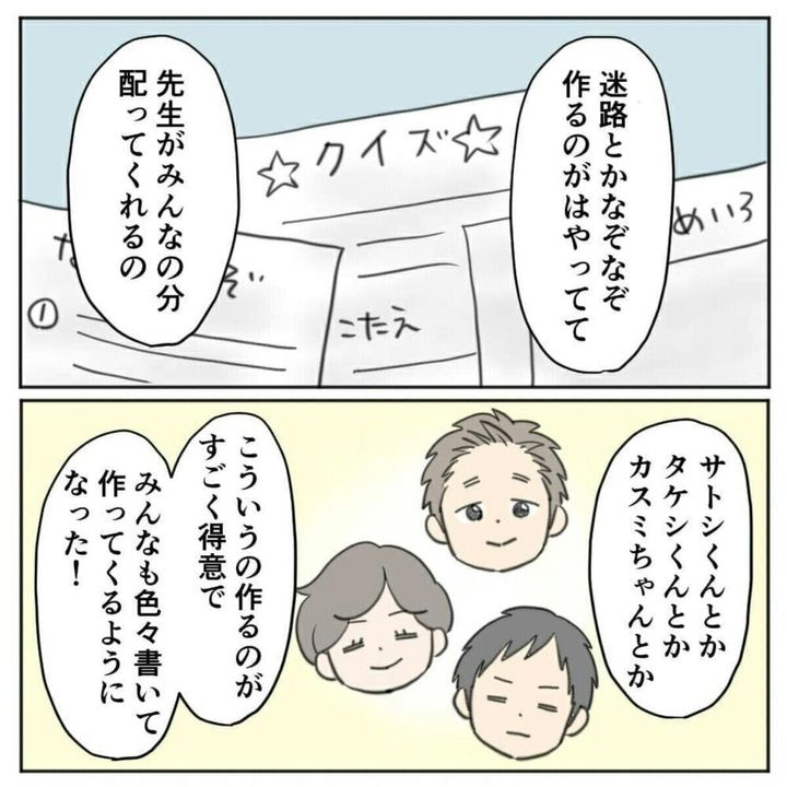 先生にも隣の子にもうまいと言われうれしそうな次女を見て、先生のやり方一つで子どもの人生に大きな影響を与えられるのだと感じたのと同時に、次女ちゃんがクラスメートの名前をいうことが今までなかったなと思うまりまりさんでした。
