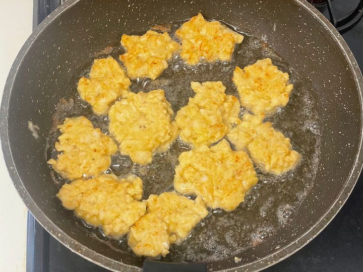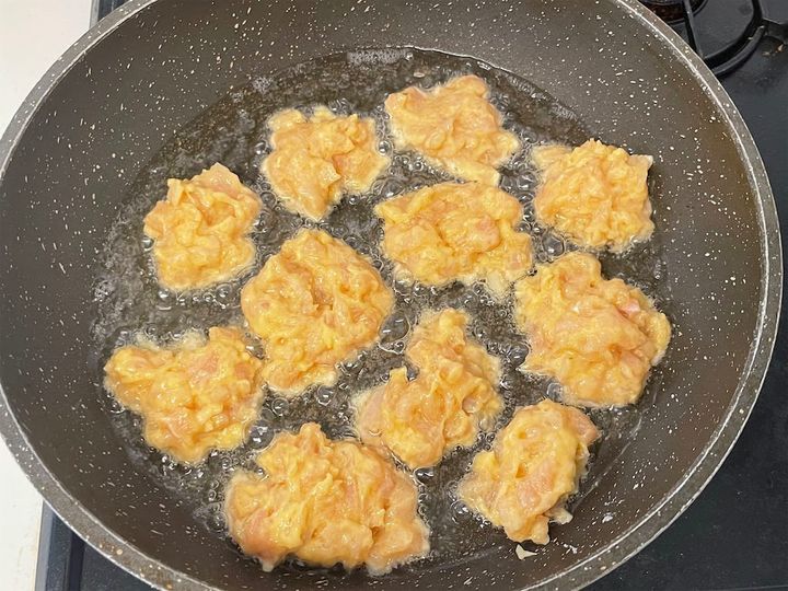揚げ油を少しつけたスプーンを2つ使い、薄型の丸い小判型にして入れます。