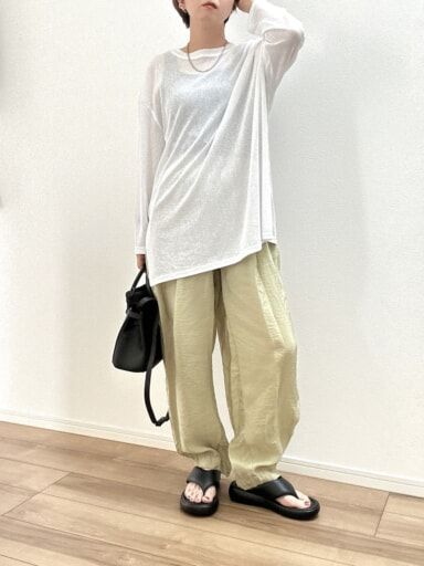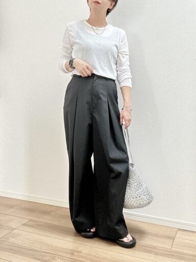 パンツはワイドシルエットが今の気分にピッタリ。トップスの透け感とパンツのワイド感のバランスがお洒落を格上げしてくれます。女らしさときちんと感を兼ね揃えられているので、あえて足元はサンダルで崩すと、狙った感のないヘルシーな雰囲気に仕上がります。