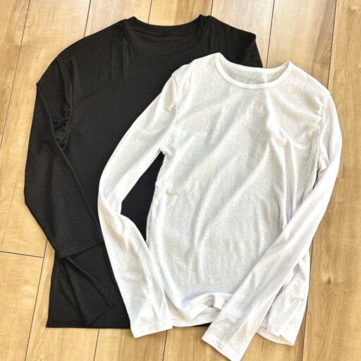 そんな方におすすめのシアートップスが、楽天の【Dark Angel(ダークエンジェル)】で見つけた「シアーロングスリーブTシャツ」。大人世代でも採り入れやすいかすかな透け感が絶妙で、しかも驚きの¥1,000台というプチプラ。安っぽく見えない生地感と、チクチク感のないやわらかな着心地が、高見えを叶えてくれます。今回は、クルーネックタイプと、サイドスリット入りのオーバートップスの2種類を購入して着回ししてみました。