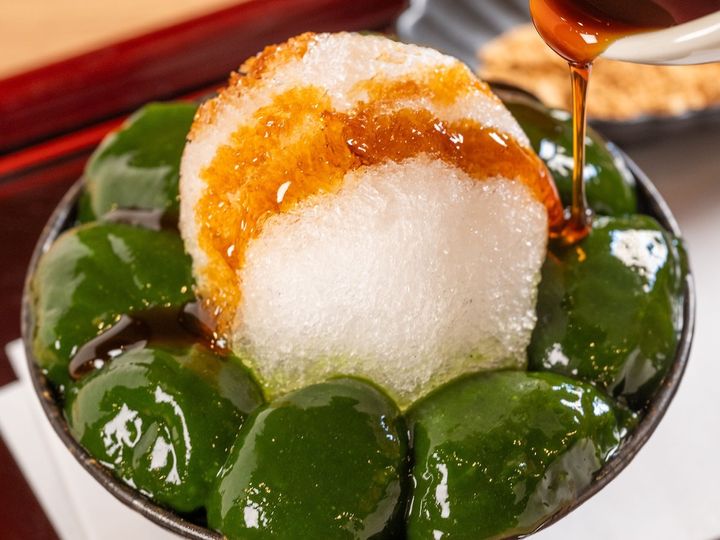 かき氷を囲むようにしてレイアウトされた大粒の抹茶わらび餅。深みのある濃い抹茶色が艶やかで芸術的な美しさを放ちます。