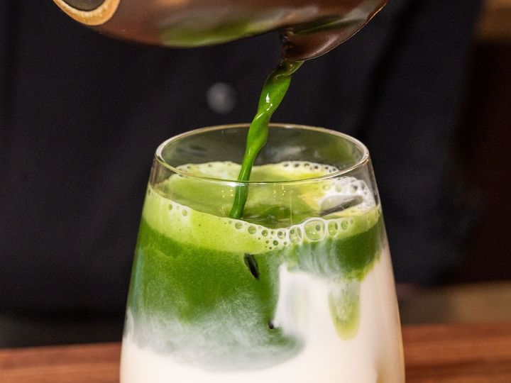 真横からのアングルも実にお見事!注がれる抹茶とミルクの芸術的なグラデーションにも感動です。