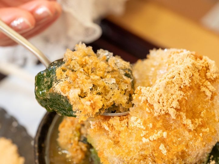 こんな風に黒蜜ときな粉をたっぷりかけたかき氷と一緒にいただくのもおすすめです。
