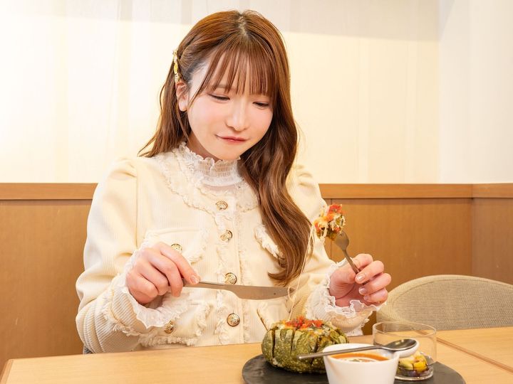 抹茶味のブールは見た目以上にふわっふわで、とにかくエアリー♪ ナイフを軽く入れるだけでも抹茶の香りがふわりと漂います。びよ~んと伸びるチーズをたっぷり絡めて召し上がれ。野菜のうま味が溶け込んだトマトベースのオリジナルスープとも相性抜群です。