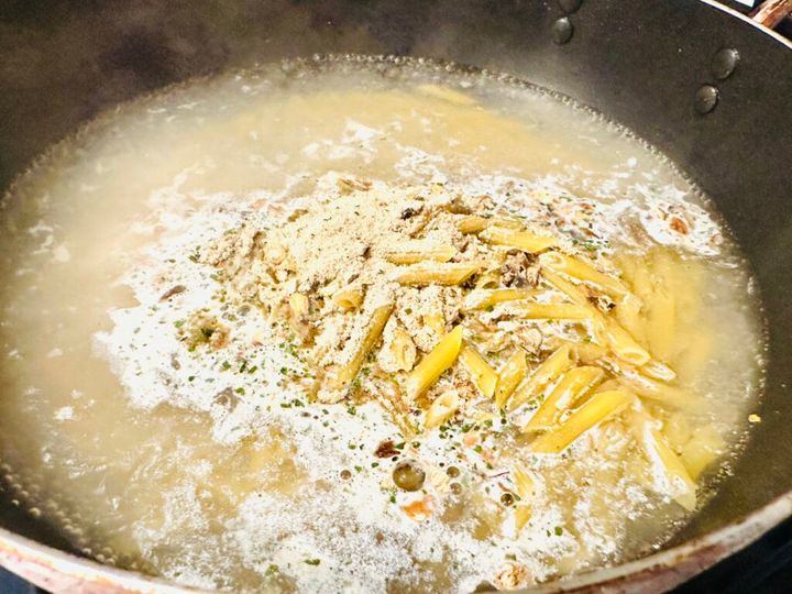 袋の中身はレトルトではありません。500mlのお湯を沸騰させ、全量を加えて8~10分茹でるだけ。パスタソースの素となる粉末とショートパスタ(ペンネ)が混ざった状態でひと袋に入っています。容量は2人前なので、半分使って残しておくことは難しく、一気に作ってシェアして食べるのが良さそうですね。