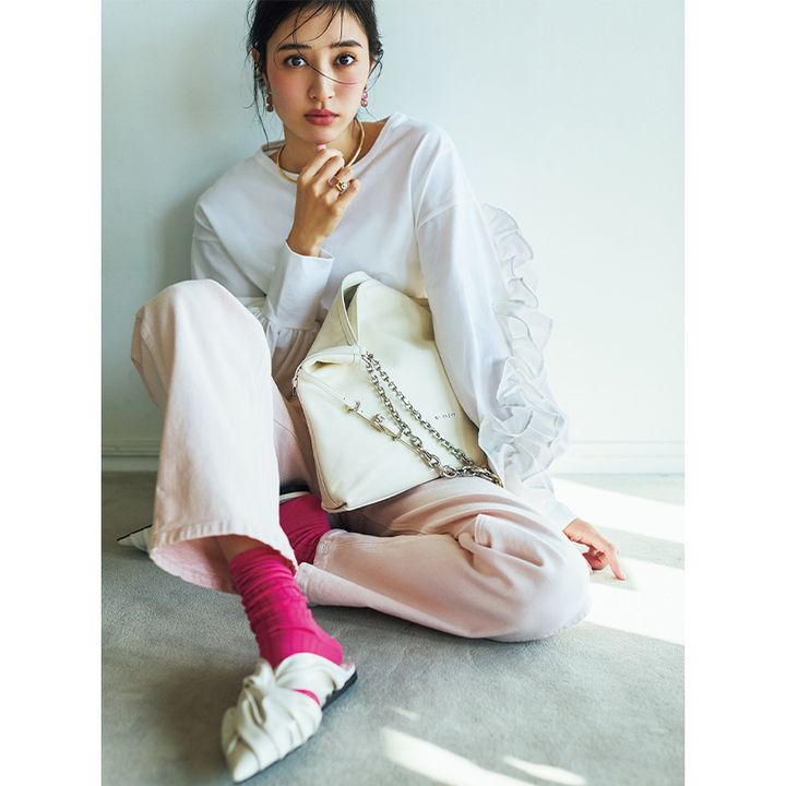 少しゆとりのあるシルエットに、花びらのような大振りフリルが目を引くこと間違いなし。片方だけについているので甘くなりすぎないのもポイント。どんなボトムスとも相性良くコーデを甘く仕上げてくれる1枚。 カットソー¥17,600(Cen.)パンツ¥50,600(リダン/ロンハーマン)ピアス¥1,023,000チョーカー¥968,000リング(下)¥682,000(上)¥264,000(すべてポメラート/ポメラートクライアントサービス)バッグ¥412,500シューズ¥122,100(ともにジバンシィ/ジバンシィ ジャパン)ソックス¥2,640(ホイサム)