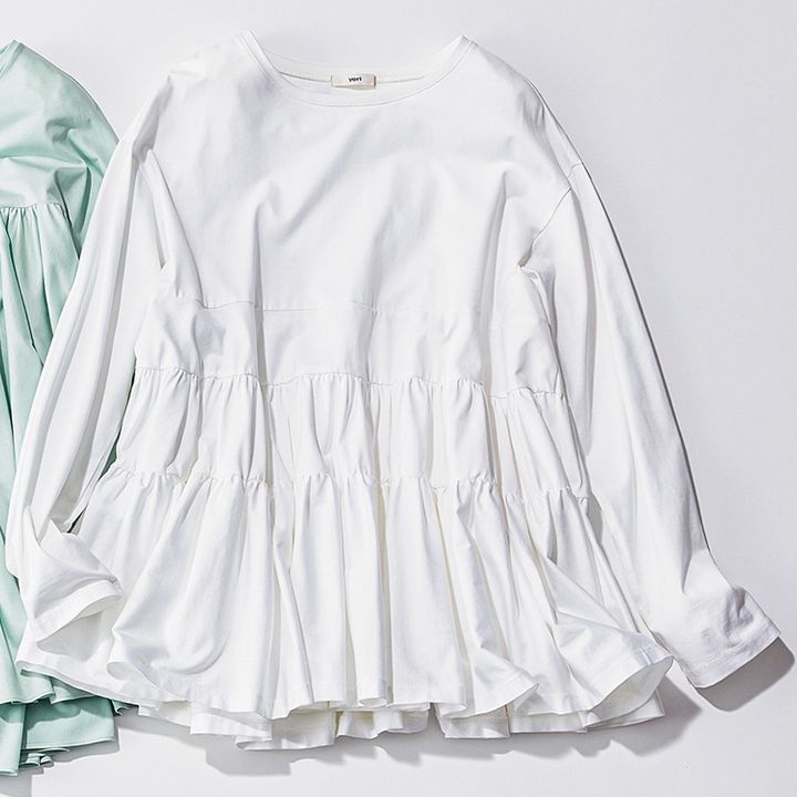 甘派ファンの多いyoriは、楽にキレイ見えしツヤとハリ感、適度な肉感のしっかりとしたフレアロンT。体のラインを拾いすぎず、伸縮性があるので動きやすいのも売れ続けている理由。 カットソー¥15,400(yori)
