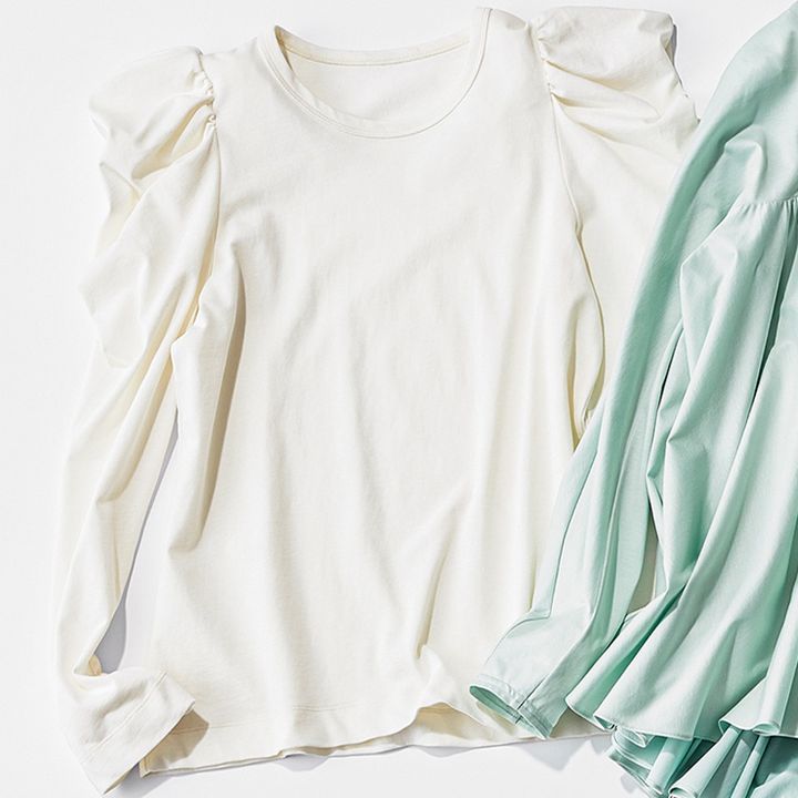 程よいギャザーの入ったパフスリーブはお仕事着としても最適。 カットソー¥9,900(デミルクス ビームス/ビームス公式オンラインショップ)