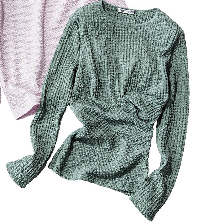 絶妙なニュアンスカラーとさりげないギャザーがデニムスタイルにマッチ。 カットソー¥3,990(ザラ)