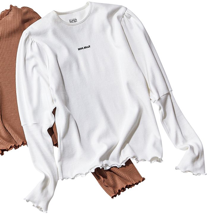 ソフトな着心地のパフスリーブトップスはフロントのロゴが♡ カットソー¥20,900(ホリデイ)