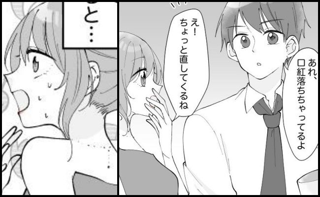 しっかり口紅を塗っていたことから、歯にもたっぷり口紅が付いており……。これまで歯紅をすることがなかったため衝撃を受けながらも急いで歯に付いた口紅を拭き取り、メイクもお直し。