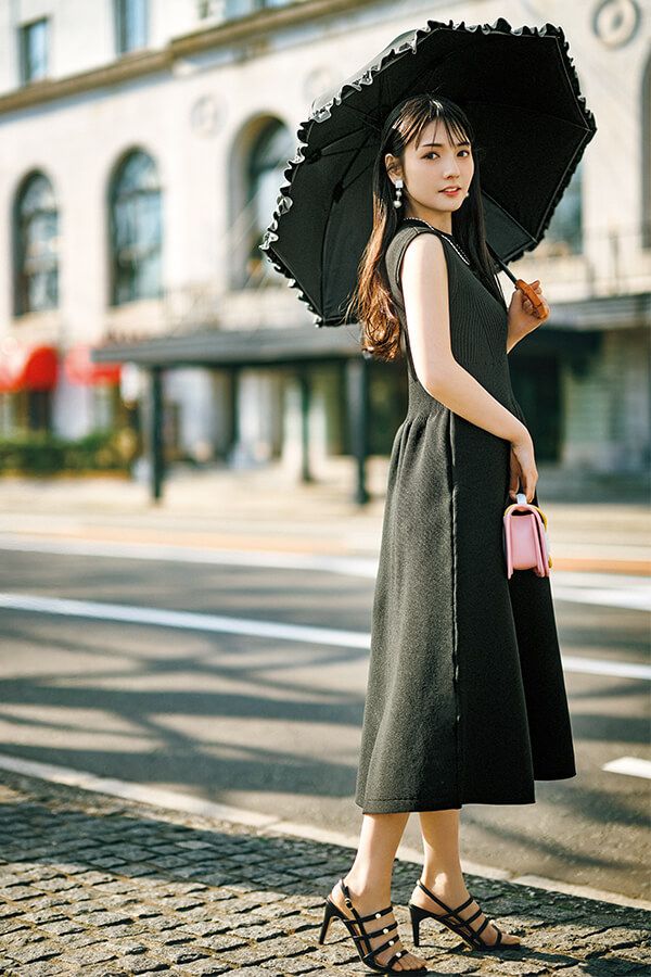 ワンピース¥33,000/ルル・ウィルビー(アルアバイル) イヤリング¥12,100/アビステ ネックレス¥20,900/ココシュニック オンキッチュ(ココシュニック) バッグ¥143,000/ピエール アルディ(ピエール アルディ 東京) 靴¥33,000/銀座かねまつ(銀座かねまつ6丁目本店) 日傘/編集部私物