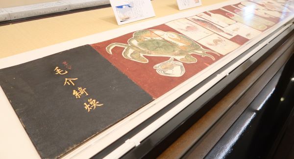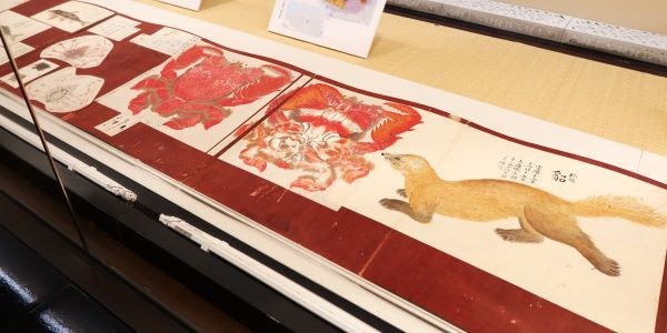 赤い甲羅が鮮やかな「アサヒガニ」。甲羅のぶつぶつした質感や、足の形まで迫力ある詳細な描写が目を引きます。 右隣には毛並みがフワフワした「貂(てん)」の図があり、足の爪の先まで毛の1本1本を描いています。