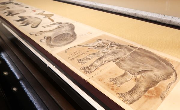 享保13年(1728)、長崎に象が舶来し、徳川吉宗に献上されました。 象は江戸まで歩いて移動したとか。絵のモチーフとしても江戸の人々の興味と好奇心を搔き立てたのではないでしょうか。 同図には、カワウソや猪のような日本の動物も描かれていますが、ヒョウのような珍しい動物も描かれています。