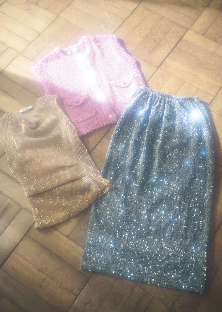 〈右から時計回りに〉スパンコールスカート 5,599円/Silly by Lit's スパンコールトップス 82,500円/ドロシー シュー マッハ(サン・フレール)ピンクラメベスト 8,690円/31 Sons de mode(ヒロタ)