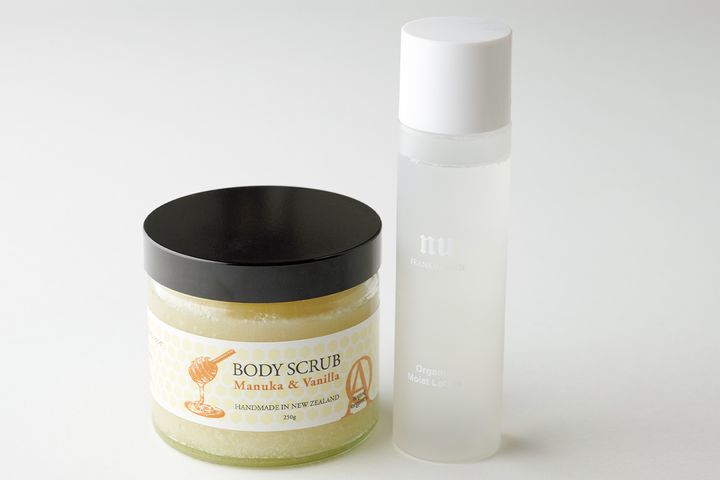 30代に入って直接肌に触れるコスメもすべてオーガニック系にシフトしました。左・ボディスクラブ マヌカ&バニラ¥4,290(アビオス)右・オーガニックモイスト化粧水¥6,600(Nu Frankincense)