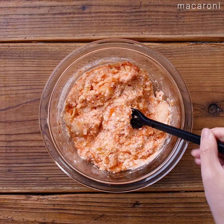 2: 白菜キムチ、とろけるチーズを加えて混ぜ合わせます。