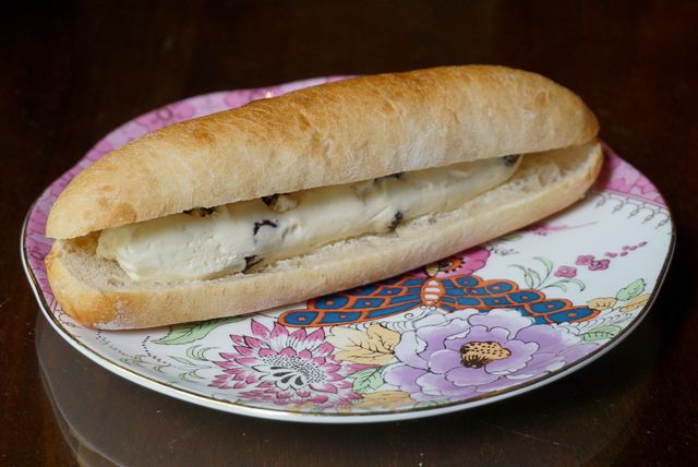 ベーカリーコーナーから紹介したいのは「ラムレーズンスティック(430円)」。ラムレーズン入りのバタークリームを、ソフトフランスで挟んだパンです。