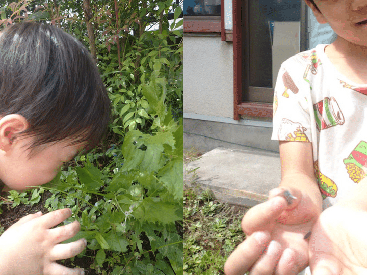 写真はこれまで食べなかった大葉をまさかの直で食べる次男、そして、ちょうちょを初めて捕まえられるようになった長男です!子どもって、たくましいものです笑