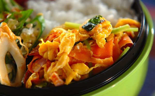 ミツバ入りのスクランブルエッグはカラフルでお弁当おかずに喜ばれますよ。ベーコンの風味があるため、野菜が苦手な子どもでも食べられそうです。ニンジンをリボン状にスライスすることで、火の通りが早くなり、サッと作れます。