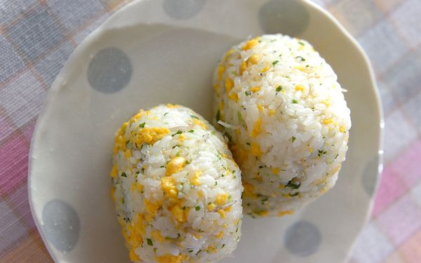 刻んだミツバと卵のそぼろで作ったおにぎりは、鮮やかな色が目を引きます。そぼろを甘く味付けし、チリメンジャコの旨みが強いためミツバの苦みが気になる子どもも食べやすいですよ。ミツバは細かく刻むとごはんに混ぜやすいです。