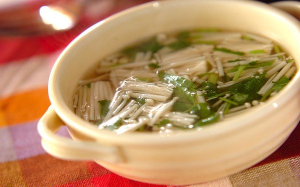 ミツバは和食材として知られていますが、コンソメスープにも合いますよ。エノキとミツバのシンプルなスープは、食感と香りが抜群で、ハンバーグやエフライなどと好相性。夜食にも、もってこいです。