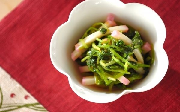 ミツバの香りと食感を活かす、酢みそ和えです。調味料は砂糖・酢・みその3つだけ。味がぼやけないよう、ミツバを茹でたらしっかり水気を絞っておいてくださいね。カマボコの代わりにちくわでアレンジしてもOKですよ。