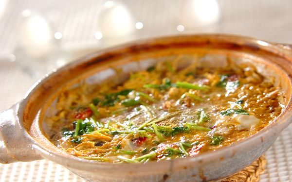 ナンプラーや赤唐辛子などを使ったトムヤム風スープに、ミツバをプラス。トムヤムクンにはパクチーを入れるのが一般的ですが、ミツバでもおいしいですよ。パクチー特有の香りが苦手な方は、パクチーに比べて香りがマイルドなミツバを選ぶのも一案です。