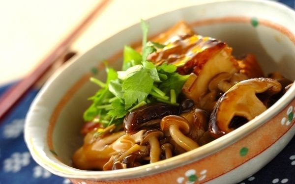 数種類のキノコと厚揚げを使う、甘辛い煮物です。風味が豊かなので、お肉なしでも満足できるのがうれしいですね。ショウガのピリッとした辛さとミツバのほろ苦さがアクセント。ミツバをたっぷりのせていただきましょう。