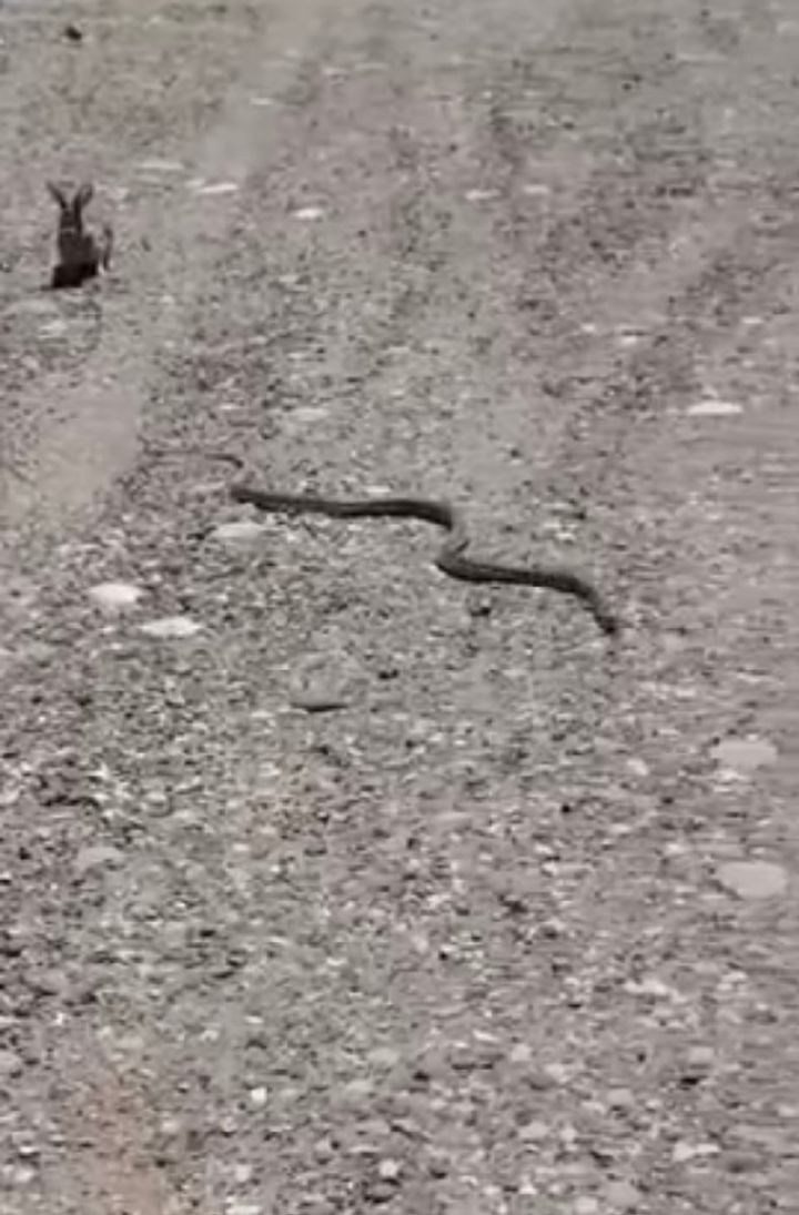 海外で撮影されたこの動画は、野生のヘビとウサギの一触即発な場面から始まります。